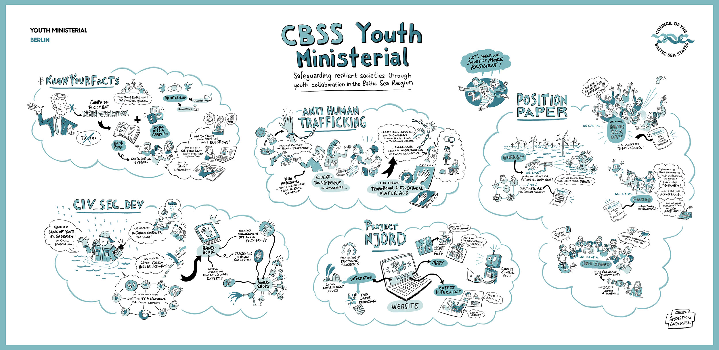 At the Baltic Sea Council’s Youth Ministerial, young participants developed project ideas to help Europe become more resilient. These included a campaign against fake news, education on human trafficking, and training on civil protection. I visualized the ideas live and subsequently created step-by-step videos for presentation on the CBSS website.