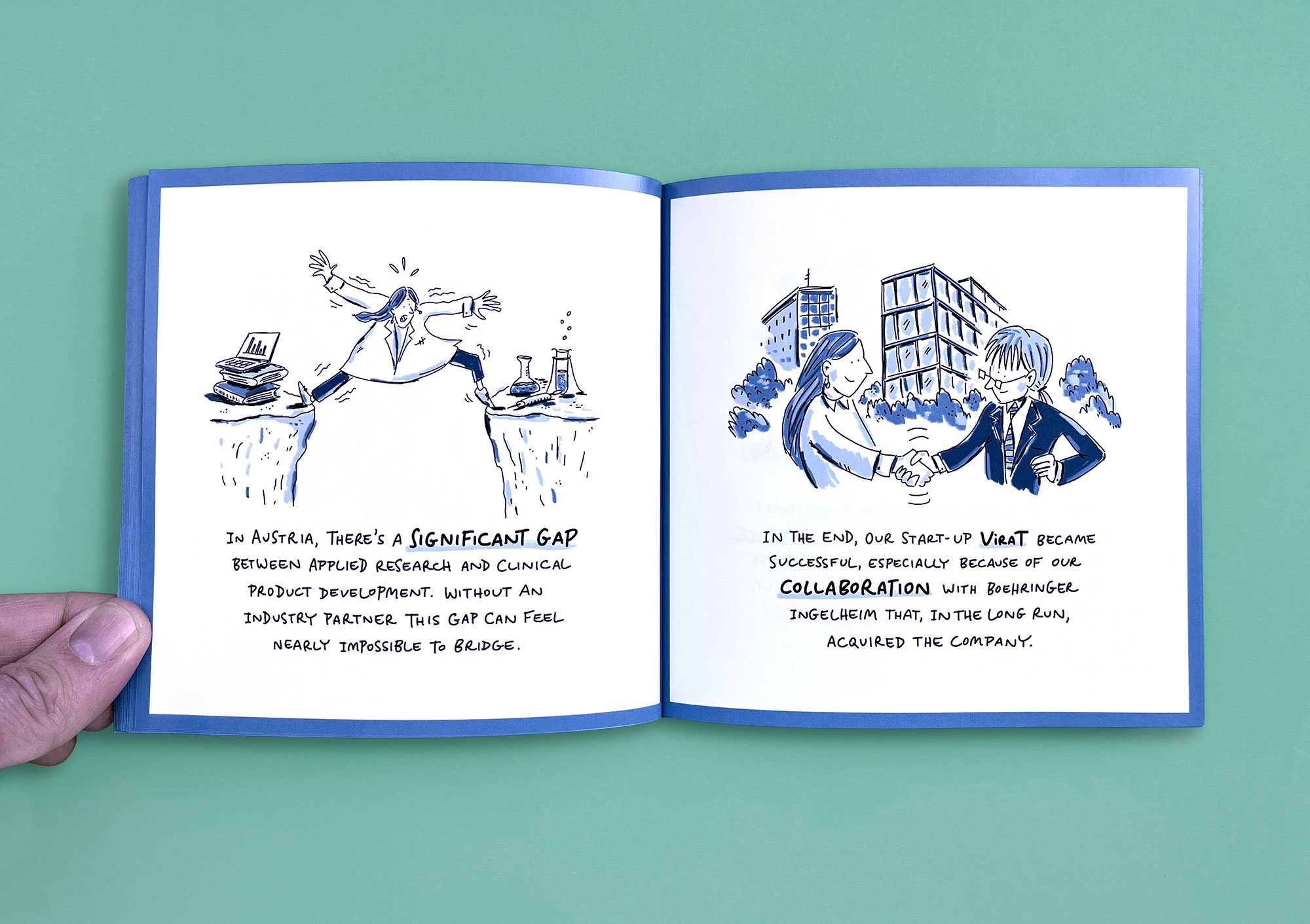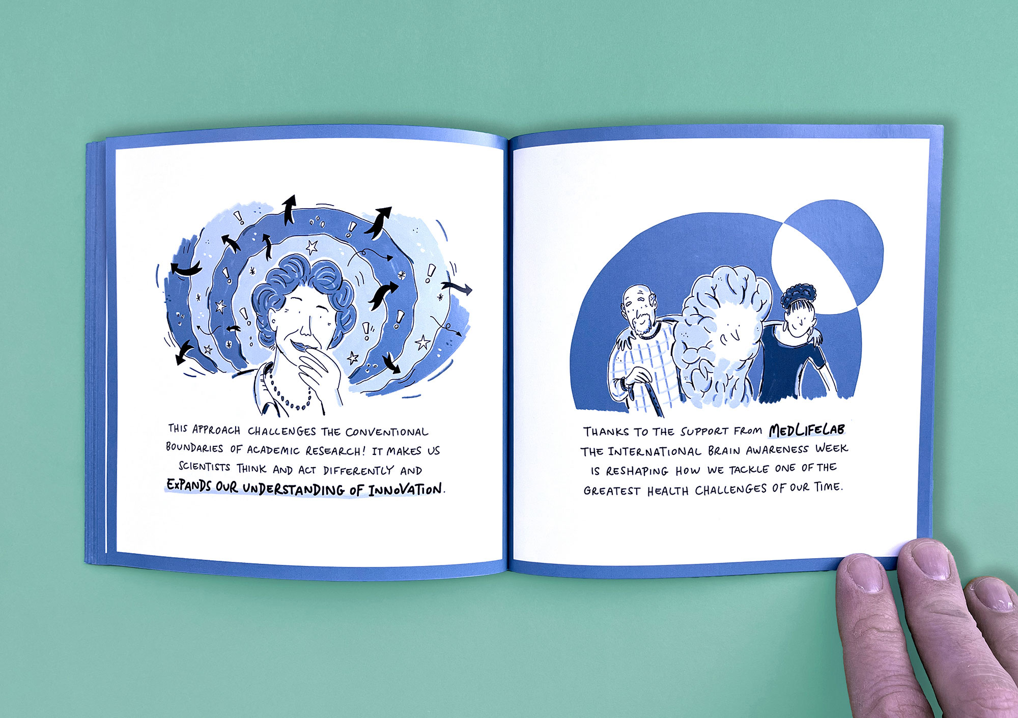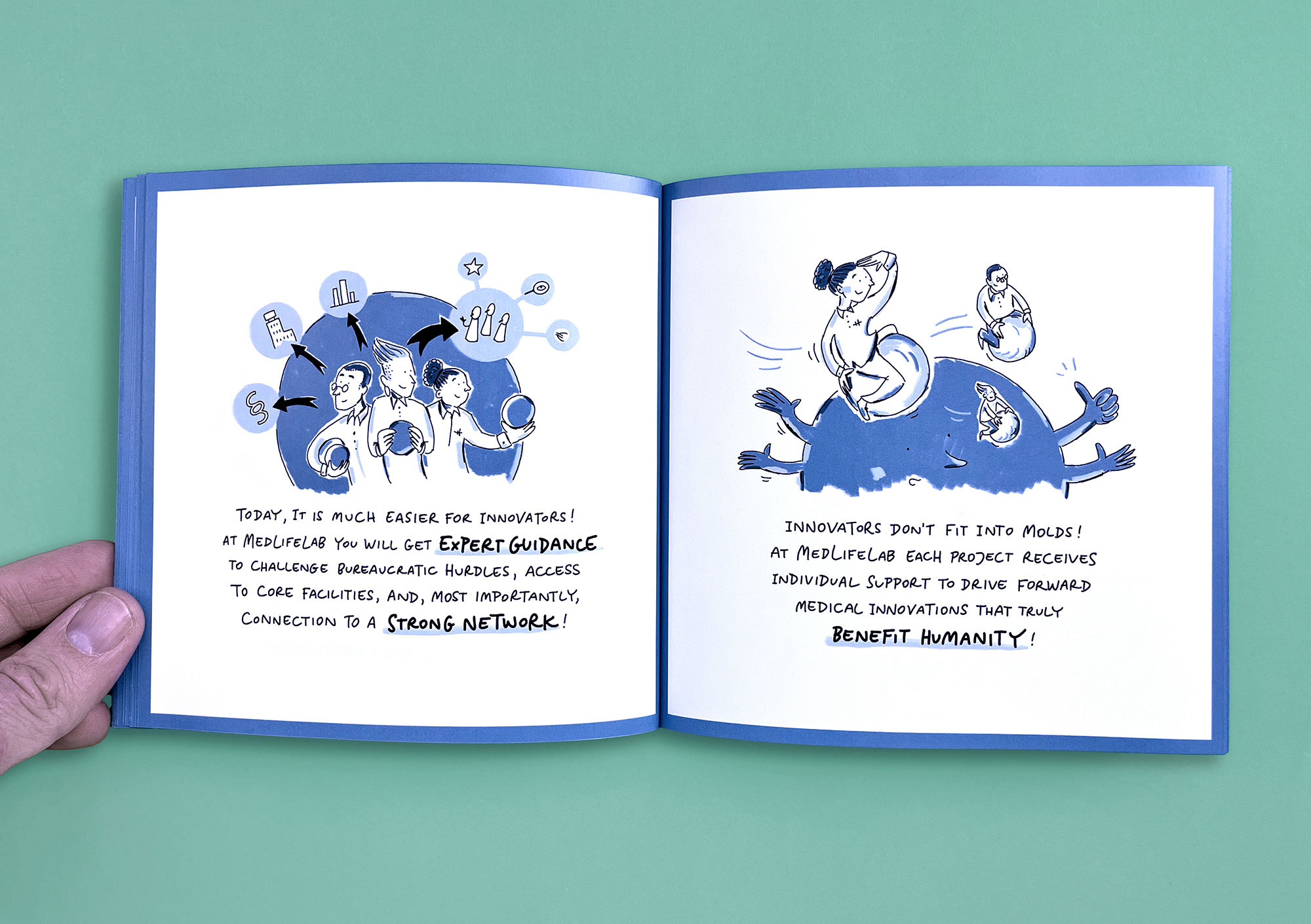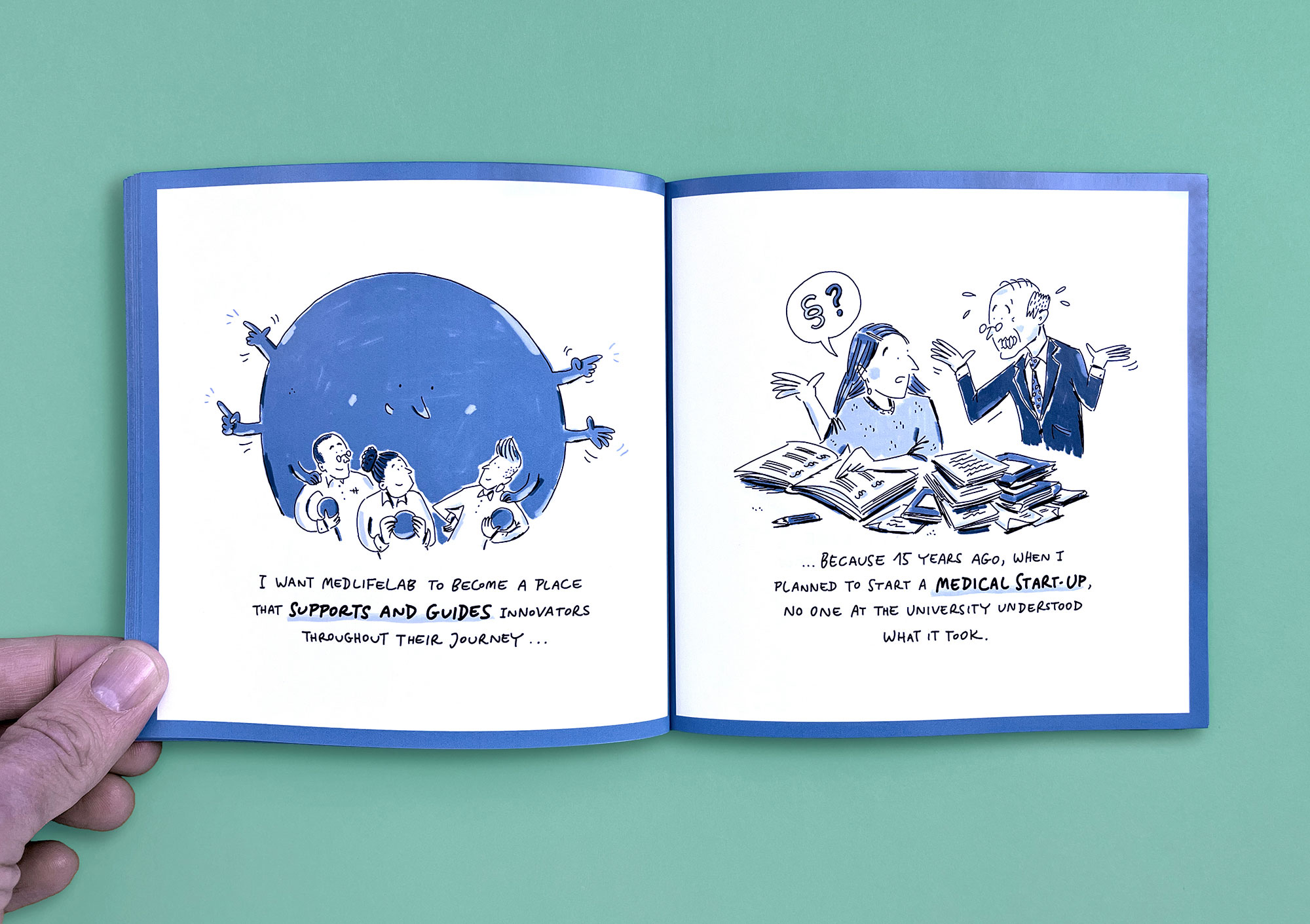 MedLifeLab is the medical innovation hub of the University of Innsbruck. Researchers here work on highly ambitious projects that have a major impact on research, life, and health. However, these projects are not always easy to communicate to the outside world. I have explained three exemplary MedLifeLab projects in entertaining, easy-to-understand comic stories. The result is a Pixi book that is given away to interested parties and potential partners — and which stands out from conventional medical publications in terms of both style and appearance.