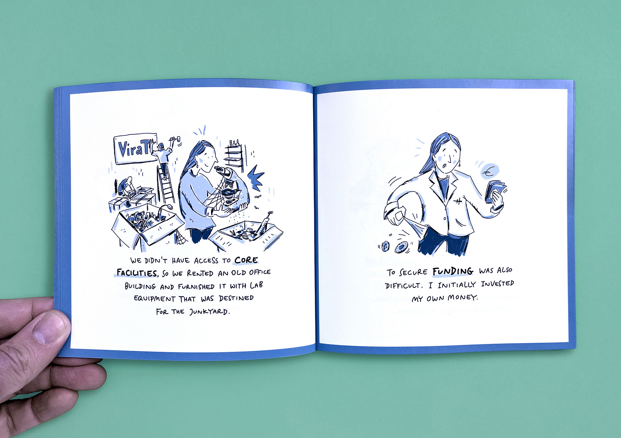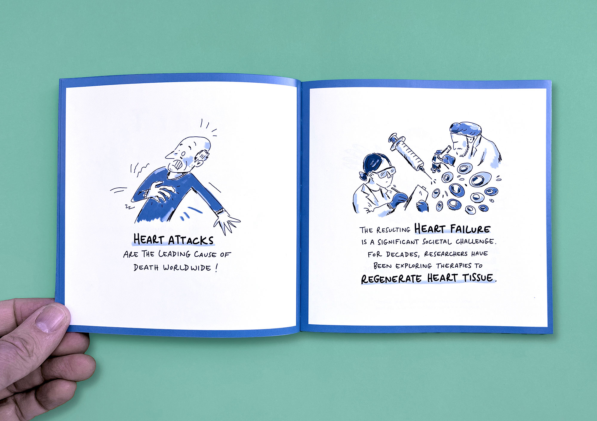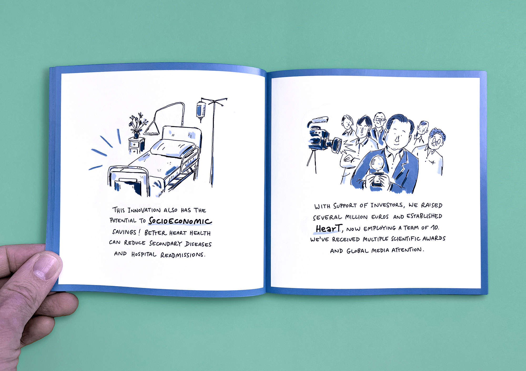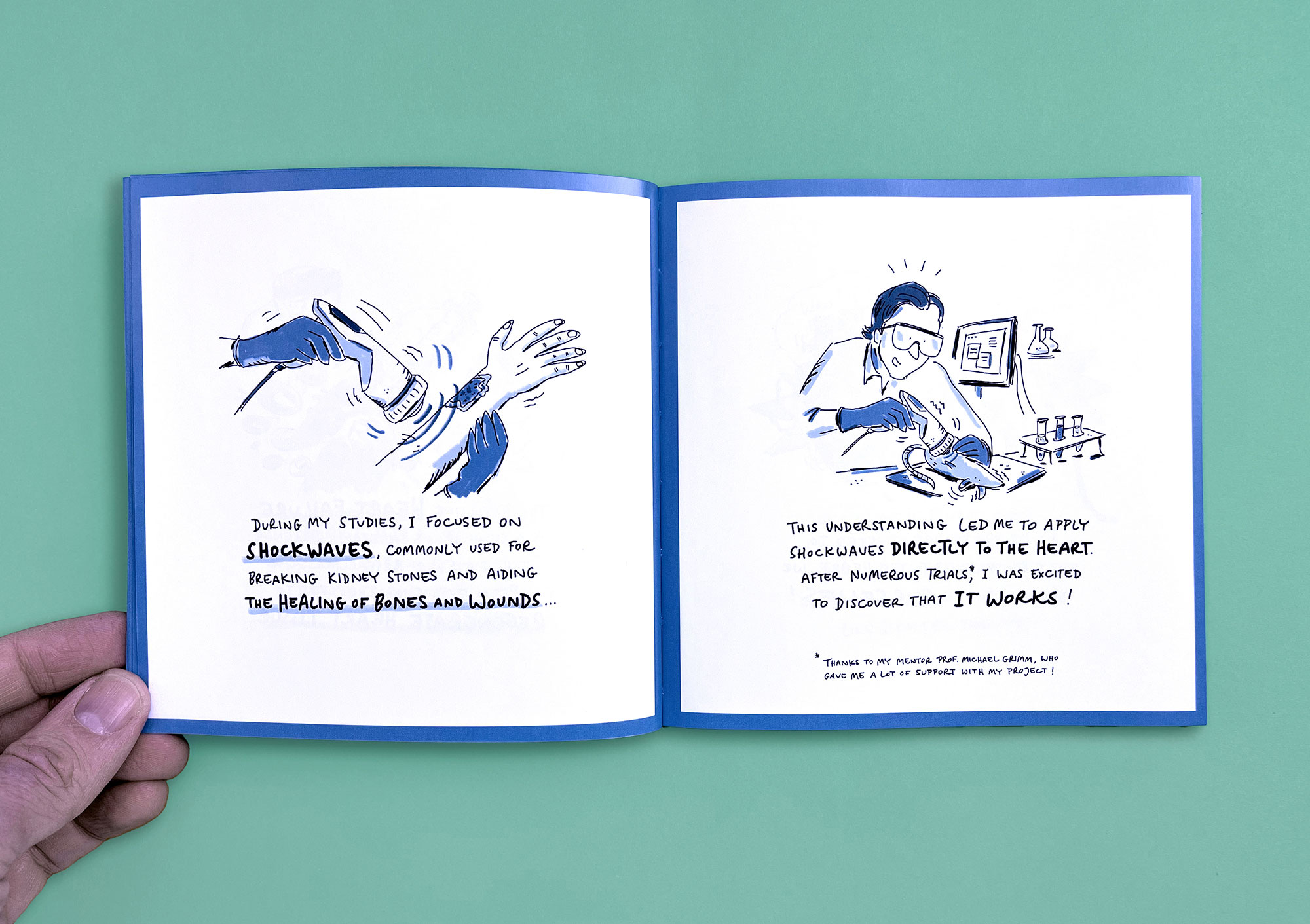 MedLifeLab is the medical innovation hub of the University of Innsbruck. Researchers here work on highly ambitious projects that have a major impact on research, life, and health. However, these projects are not always easy to communicate to the outside world. I have explained three exemplary MedLifeLab projects in entertaining, easy-to-understand comic stories. The result is a Pixi book that is given away to interested parties and potential partners — and which stands out from conventional medical publications in terms of both style and appearance.
